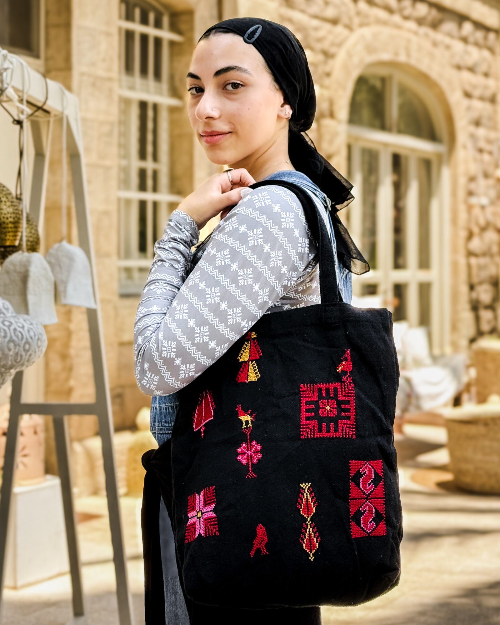 حقيبة توت سوداء مطرزة يدويًا بالتطريز الفلسطيني برسومات ترمز لمدينة رام الله، مع جيب داخلي مختوم بالجلد الطبيعي. صنعت بفخر في فلسطين.