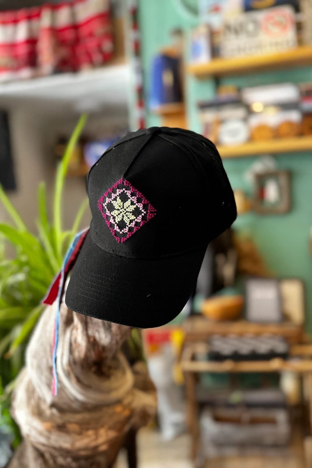 A black cap hand-embroidered with a traditional Palestinian motif. Crafted in Bethlehem, this piece blends everyday style with the authenticity of heritage, carrying the spirit of Palestinian tatreez in a modern look.