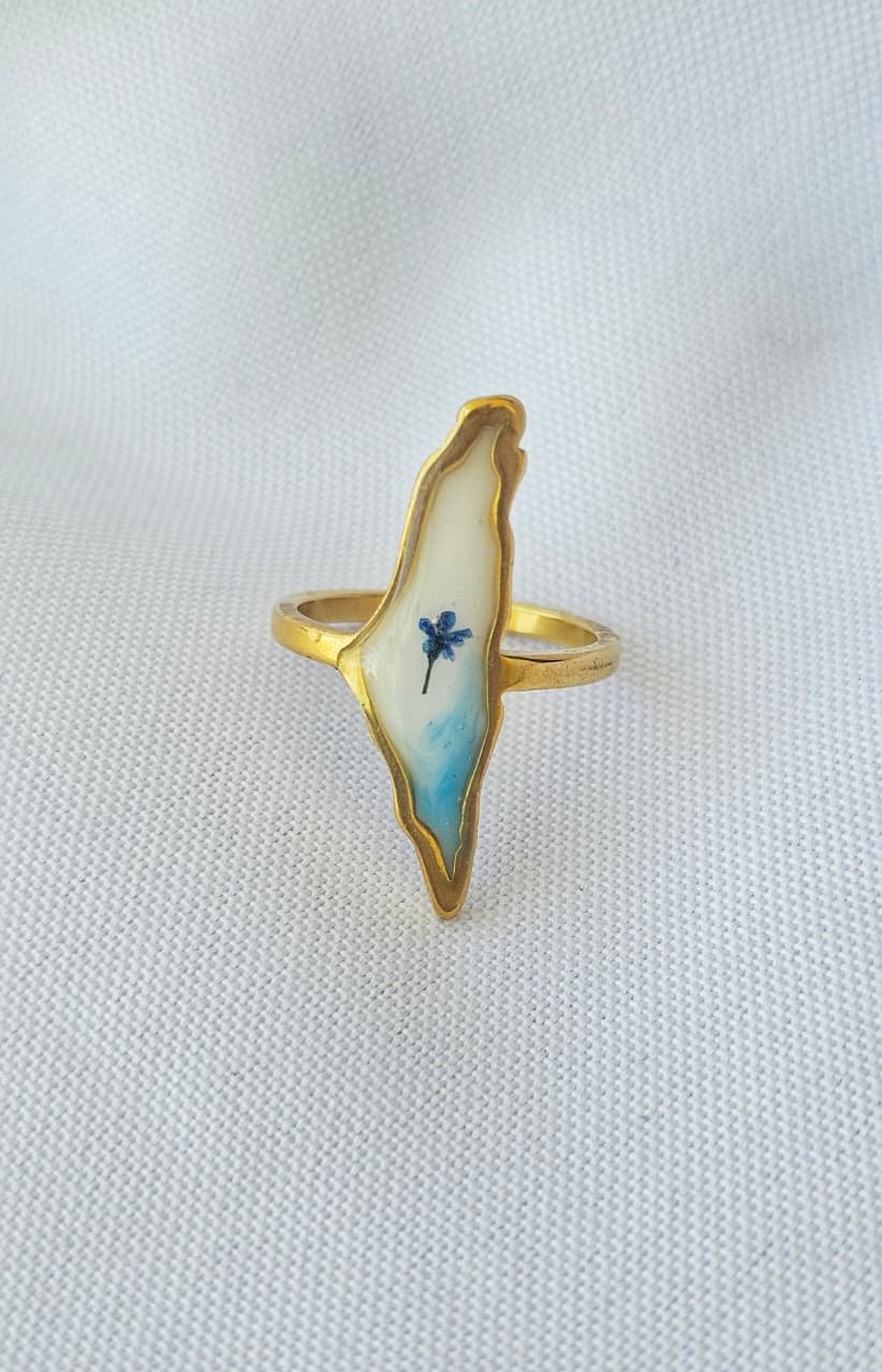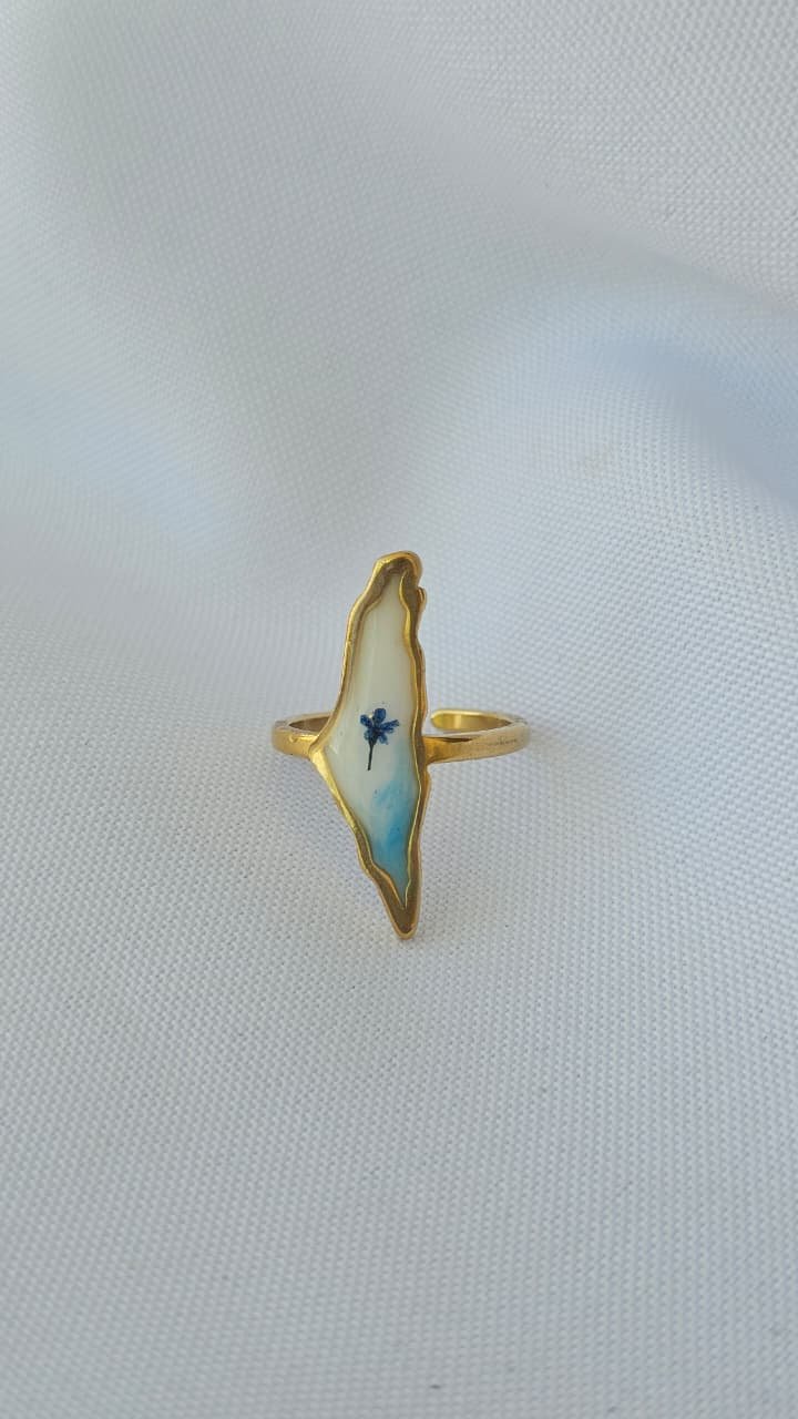 gold-tone ring in the shape of Palestine, filled with sky-toned resin and a preserved blue flower. Crafted in Sanjal.