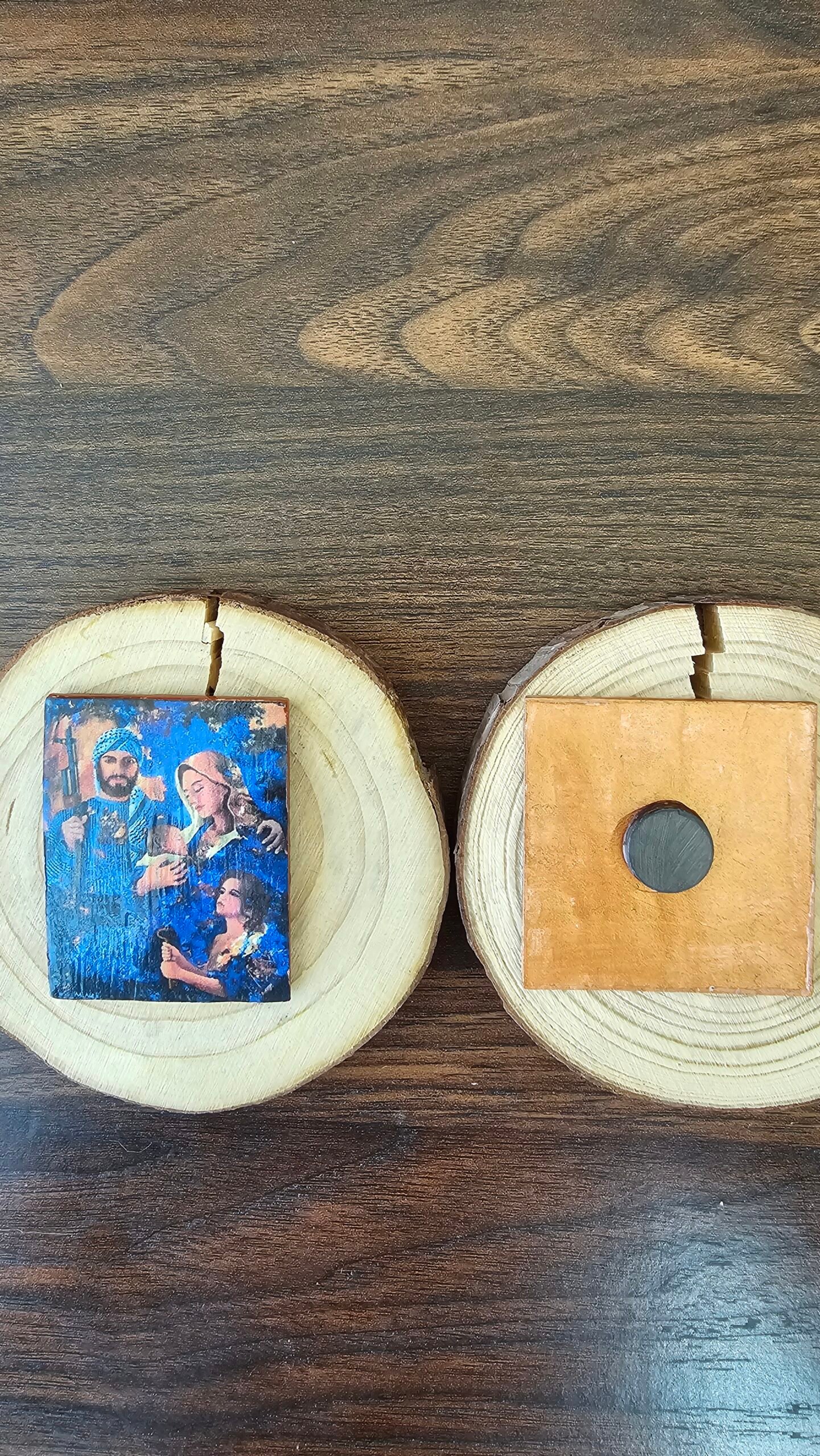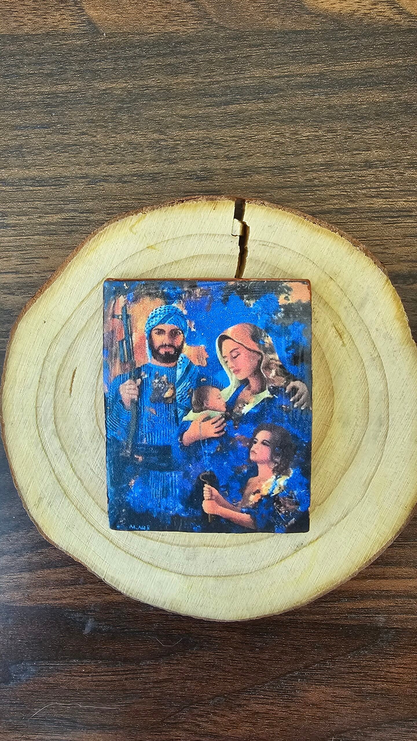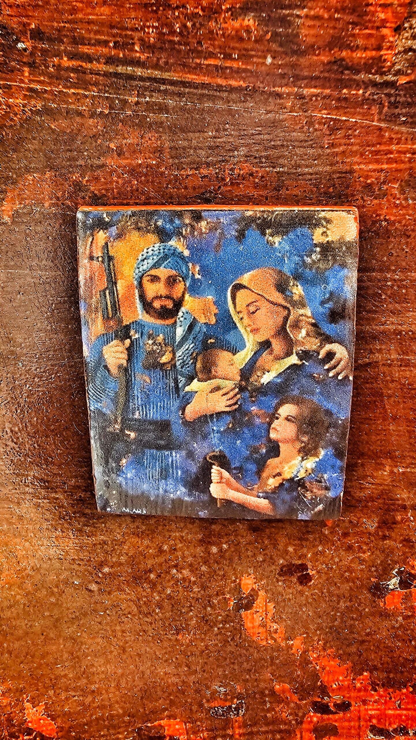 This handmade magnet reflects the famous Palestinian story of Ghubayshi ,a simple villager remembered in our folklore with the words “Stay away from the army, Ghubayshi.”