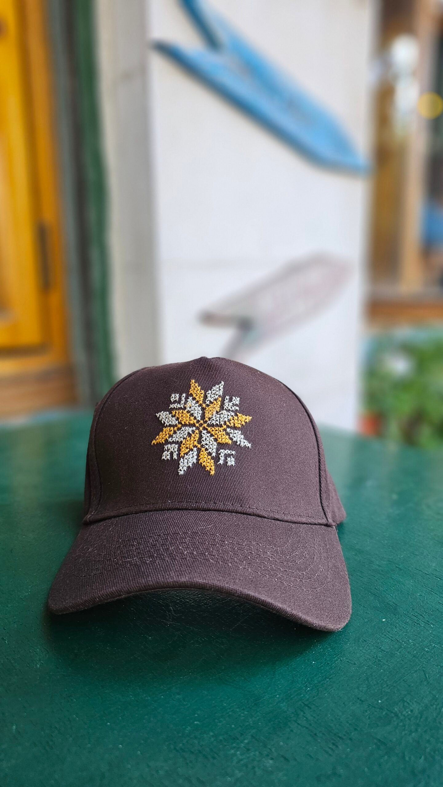 A Brown cap hand-embroidered with a traditional Palestinian Kanaan star motif. Crafted in Bethlehem, this piece blends everyday style with the authenticity of heritage, carrying the spirit of Palestinian tatreez in a modern look.