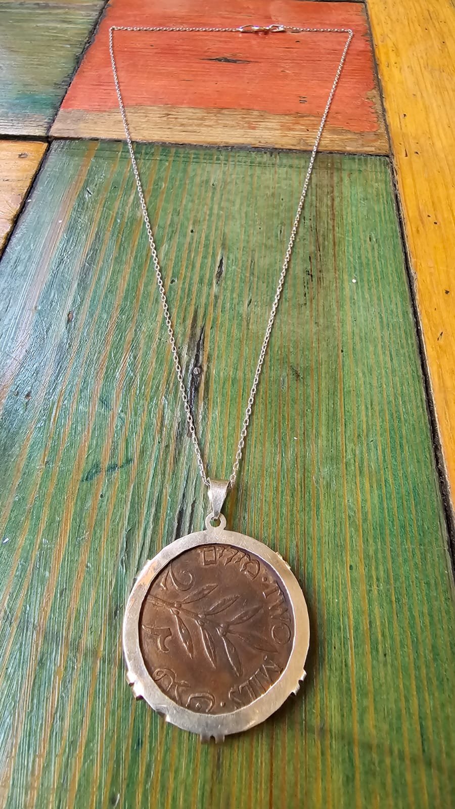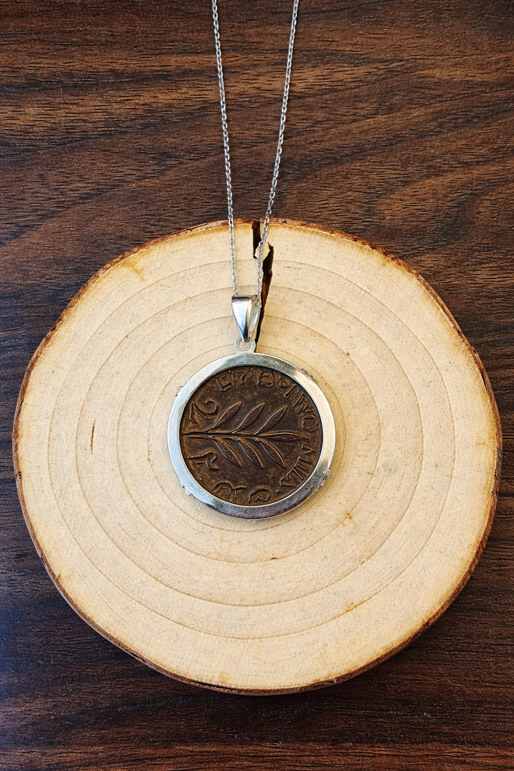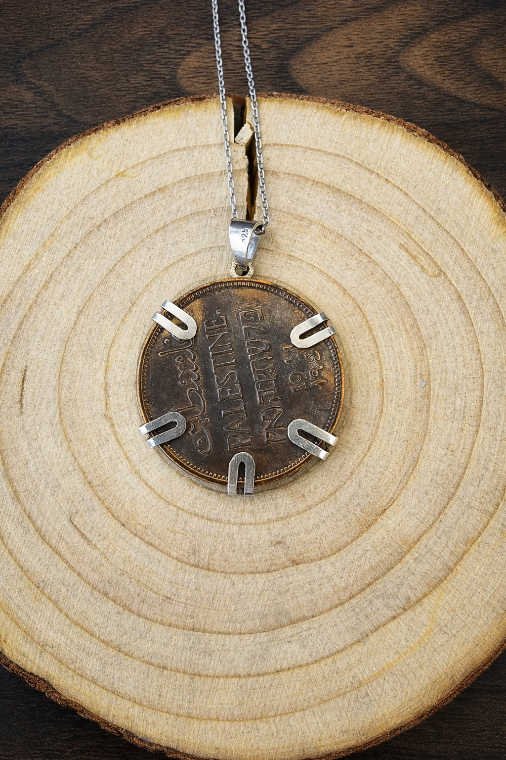 Real authentic 2 Mil Palestinian coin set in an elegant crown-frame design and transformed into a timeless necklace. This rare coin, minted during the British Mandate era, carries deep historical and cultural value, making the piece not only jewelry but a symbol of Palestinian heritage and resilience. Handmade with care, it’s a statement of identity and pride