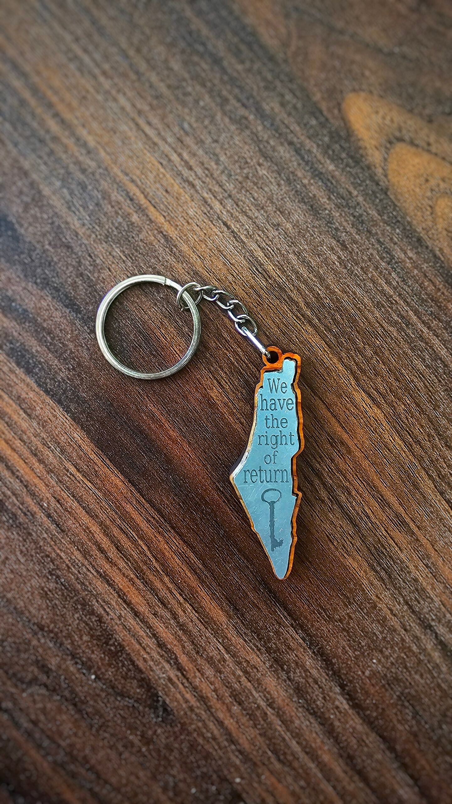 Handcrafted keychain made from Palestinian olive wood and recycled tear gas canisters. Made in Aida Refugee Camp.
